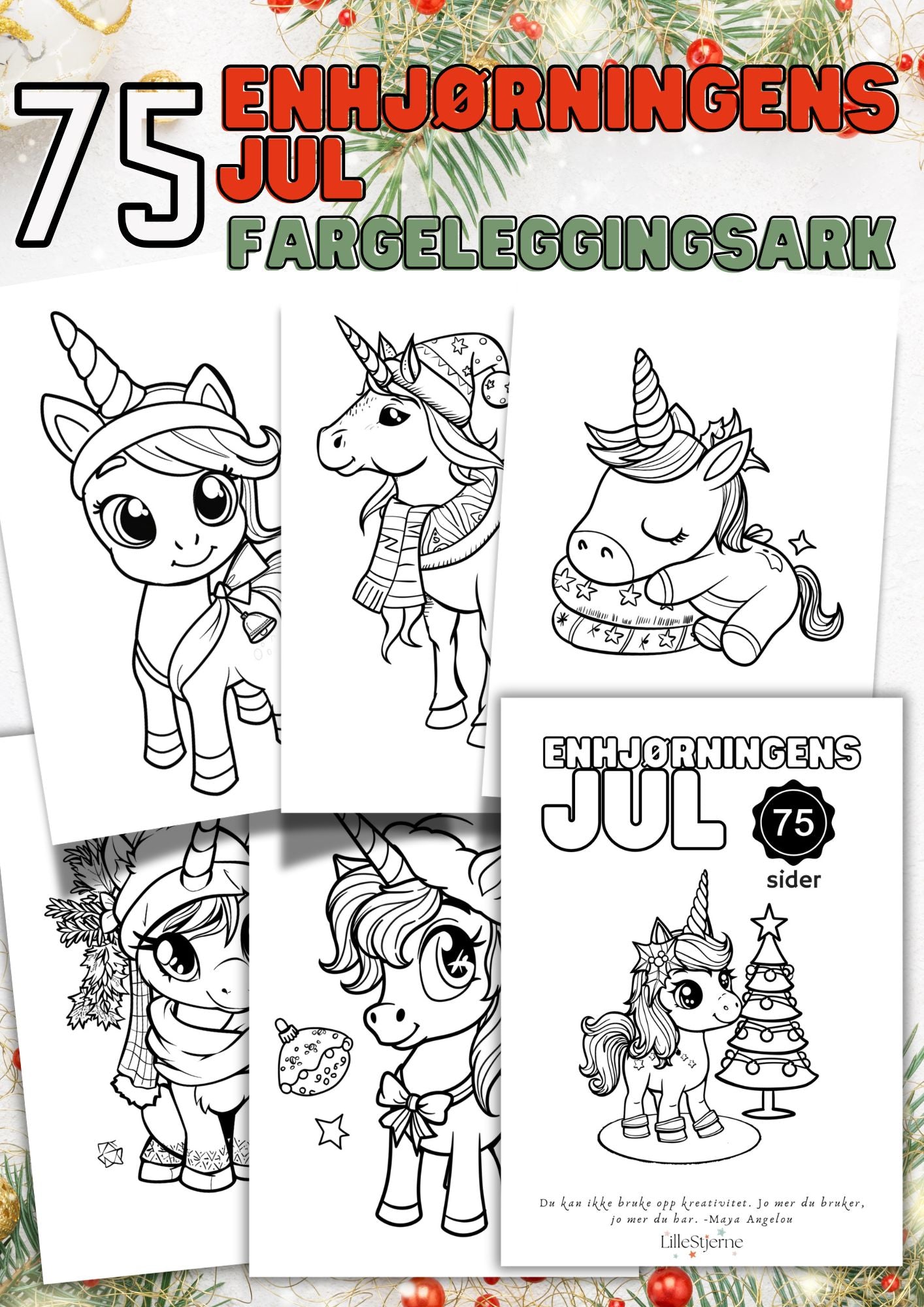 - Du får 75 sider med juleklare enhjørninger å fargelegge